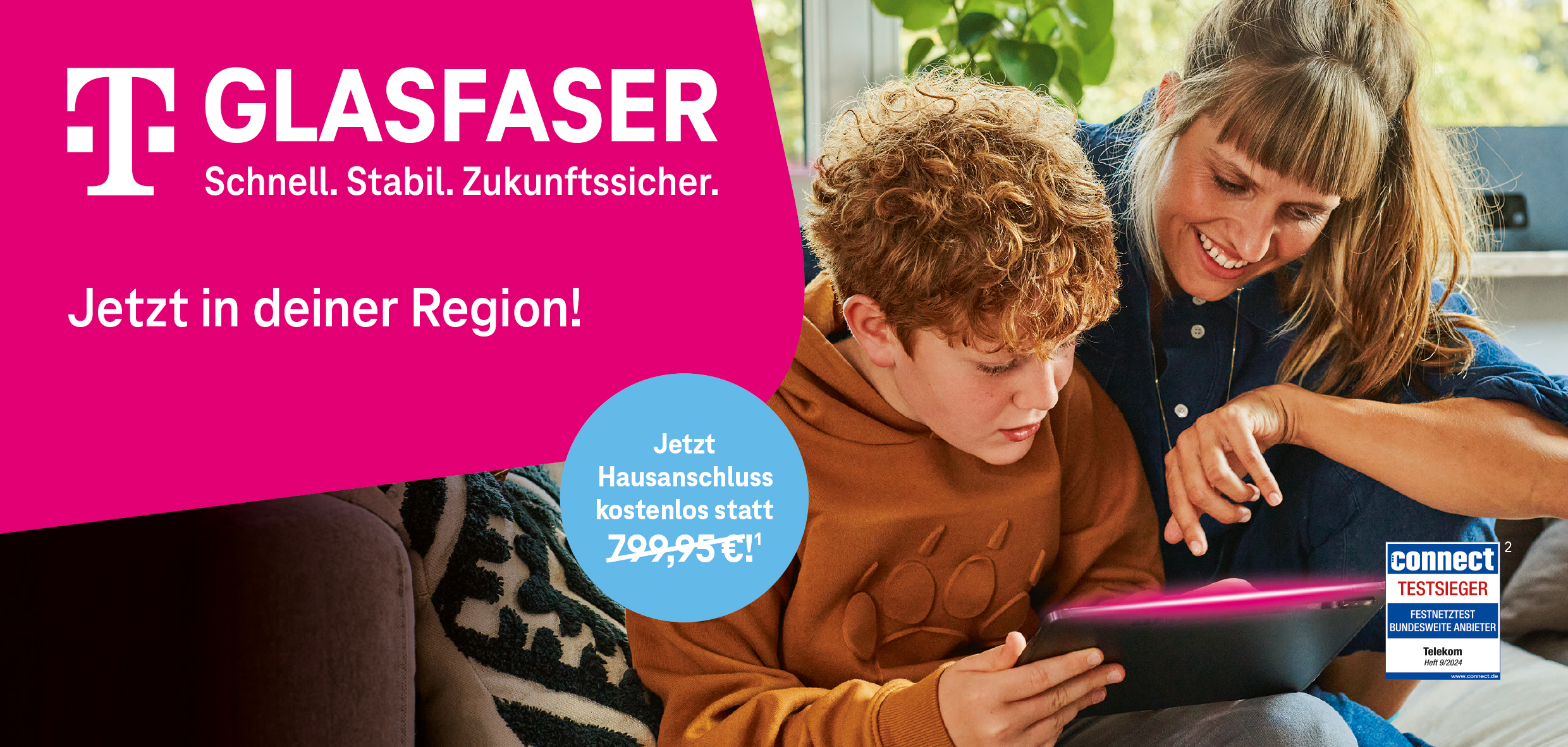 1) Für die Bereitstellung eines Glasfaser-Tarifs ist ein Glasfaser-Hausanschluss erforderlich. Sofern noch nicht vorhanden, wird dieser bei der verbindlichen Buchung eines Glasfaser-Tarifs kostenfrei neu verlegt, vorausgesetzt, die Anschlussadresse für den Tarif ist mit der Adresse des mit Glasfaser anzuschließenden Gebäudes identisch. Die Bereitstellung erfolgt, wenn Hauseigentümer/Hausverwaltung dem Ausbau zustimmen und die finale Prüfung den Ausbau bestätigt. Als Glasfaser-Tarif gilt z. B. Glasfaser 300, in den ersten 6 Monaten für 19,95 €/Monat, danach für 49,95€/Monat. Einmaliger Bereitstellungspreis für neuen Telefonanschluss 69,95 €. Mindestvertragslaufzeit 24 Monate. Durch Eingabe einer Adresse auf der Internetseite telekom.de/glasfaser kann geprüft werden, ob diese in einem Glasfaser-Ausbaugebiet liegt. 2) connect Breitband- und Festnetztest, Heft 09/2024, Testsieger/sehr gut „Festnetztest bundesweite Anbieter“. Glasfaser-Tarife waren nicht Gegenstand des Netztests.Ein Angebot von: Telekom Deutschland GmbH, Landgrabenweg 151, 53227 Bonn.3) connect Breitband- und Festnetztest, Heft 09/2024, Testsieger/sehr gut „Festnetztest bundesweite Anbieter“. MagentaZuhause war nicht Gegenstand des Netztests. 4) Aktion gilt bis 03.02.2025 für Breitband-Neukunden, die in den letzten 3 Monaten keinen Breitbandanschluss bei der Telekom hatten. MagentaZuhause XL kostet in den ersten 6 Monaten 19,95 €/Monat, danach 54,95 €/Monat. Bei Miete eines Routers im Endgeräte-Service-Paket (ab 6,95 €/Monat) erfolgt eine Router-Gutschrift i. H. v. 70 €. Hardware zzgl. 6,95 € Versandkosten. Einmaliger Bereitstellungspreis für neuen Telefonanschluss 69,95 €. Mindestvertragslaufzeit für MagentaZuhause 24 Monate, für den Router 12 Monate. MagentaZuhause XL ist in vielen Anschlussbereichen verfügbar. Ein Angebot von: Telekom Deutschland GmbH, Landgrabenweg 151, 53227 Bonn.